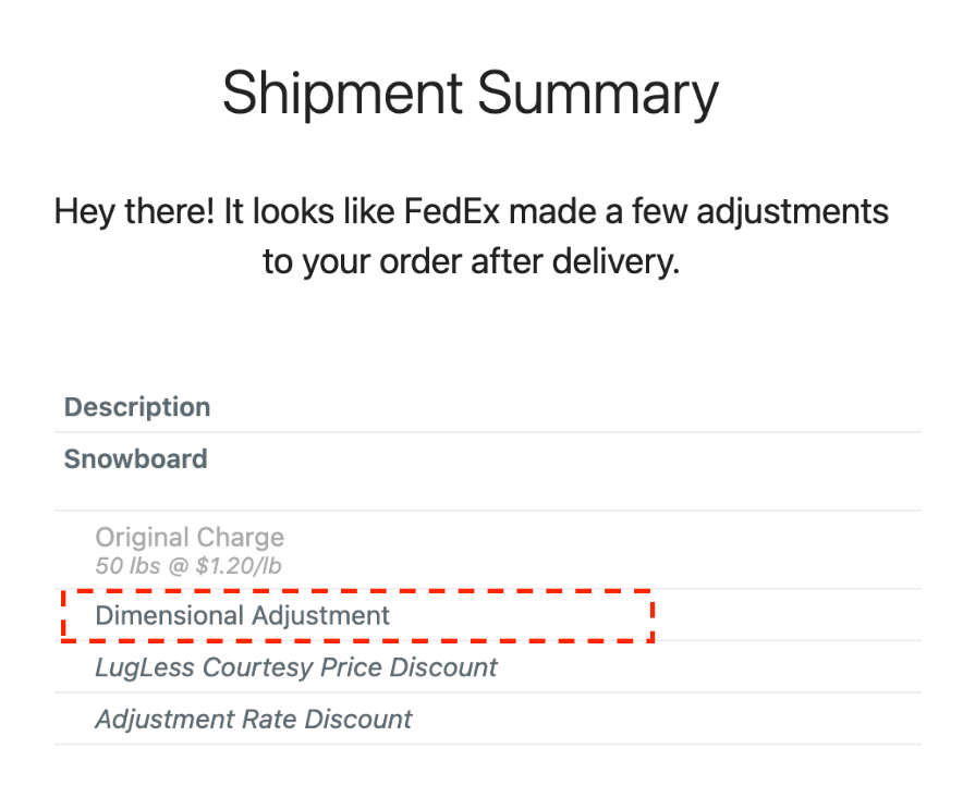 If you receive a dimensional adjustment, the carrier found that the size of your shipment exceeded the category chosen. Usually, overages are billed in accordance with the per-pound rate shown on your labels, however, if you exceed our largest category, you may be subject to additional fees.